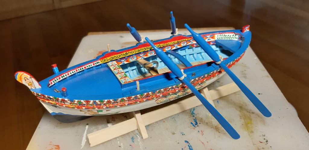 La barca in lavorazione con i sui quattro remi. Anche con tutti e sei fa un bell'effetto però due non sono per lei.