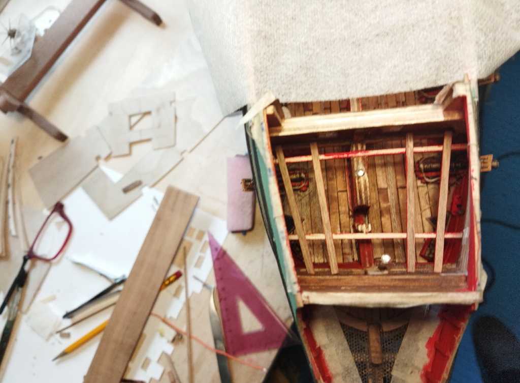 sempre con la velocità che mi contraddistingue  , ho iniziato la posa il "capo di banda" sul cassero e le serpi (?) le ho realizzate in noce solamente perchè avevo degli avanzi che tornavano bene come dimensionamento perchè in seguito verranno dipinte in nero, sulle "aperture " che permettono di visualizzare i ponti inferiori metto della carta cercando, con questa di evitare l'infiltrazione della polvere derivante dalle lavorazioni,( e non ottenendo il risultato sperato  )