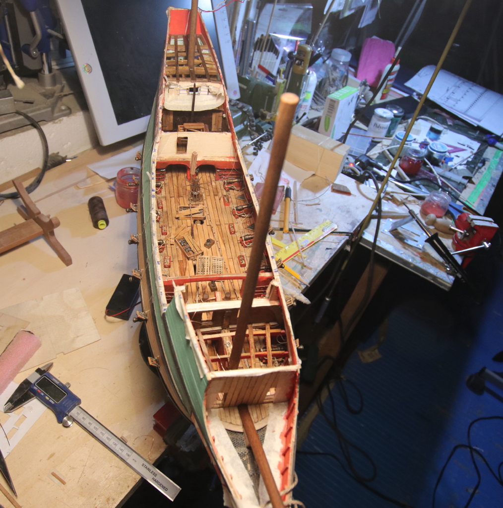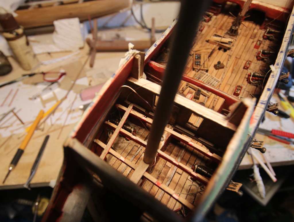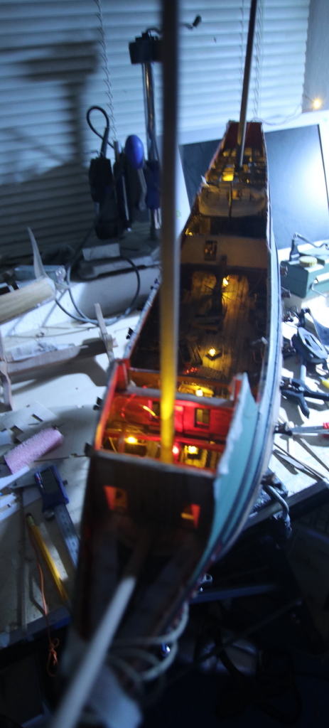per cui ho tolto la chiglia superiore (realizzata a sua volta con il compensato da 6mm) rompendo la parte intera, lasciando quella "bianca" non colorata mentre quella "rossa" accanto al led è lo scasso nel quale si adagierà il bompresso arrivando in prossimità del trinchetto. Ho incominciato la travatura sulla quale si svilupperà il tavolato del ponte sopra le corde e i bagli, sul tavolo precisamente sulla sx,( sono visibili i vari falsi ponte, realizzati con il compensato da 1 mm, che non utilizzero' visto che il tavolato verrà realizzato con listelli)