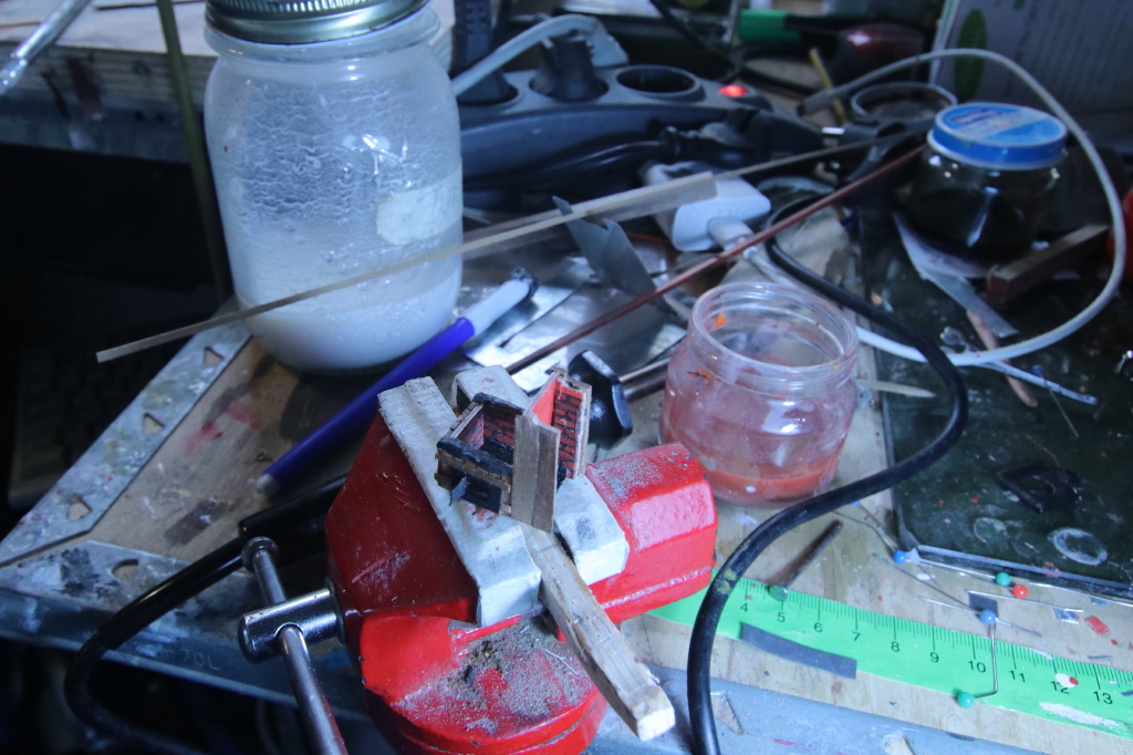 i lavori sul S.G.B. procedono, lentamente, ma procedono, dopo la realizzazione del carabottino per l' "areazione" della cucina con listelli da 0.5mm con i quali il montaggio nelle varia parti del "contorno" intorno alla cappa del camino è stato abbastanza complicato  , sono talmente fragili (per via dello spesore) che le lavorazioni di posa e assottigliamento producono "rotture e distaccamenti"