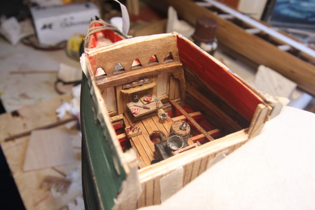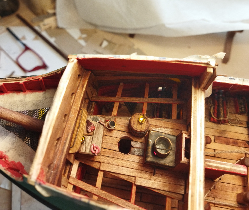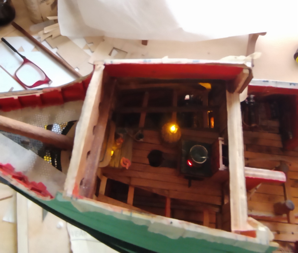 ed è stato a questo punto che mi sono accorto della cappellata, l'apertura per inserimento del legname è sul davanti, ma in questa "zona" accanto all'albero c'è la bitta delle scotte, per cui sarebbe impossibile caricare il legname, per la mancanza di spazio, nonchè il pericolo d'incendio, visto la distanza minimale dalla bitta  , per cui ho modificato l'apertura realizzandola sulla destra della cucina, ho fatto anche il tavolo di lavoro con qualche attrezzo da cucina e la botte con lanterna appoggiata sopra