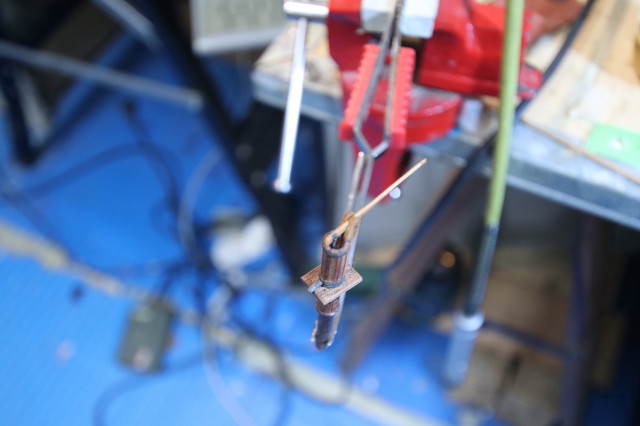 dopo la marra ho terminato la pompa di sentina, ho trovato dei disegni riguardanti un galeone veneto del solito periodo che riportano una pompa di sentina e questo è stato d'ispirazione (il Matteuzzi riporta una pompa molto schematica nella vista longitudinale, non molto dettagliata) è sviluppata con listelli di 2mm in noce su un tondino di rame di 3 mm i bracci che sostengono la barra per il pompaggio sono realizzati con il frassino, come era nella realtà, le legature sono state fatte con del filo di rame saldato per tenerlo fermo e trattato con il brunitore, il tubo di uscita dell'acqua aspirata è stato fatto con un filo di stagno da 1mm forato