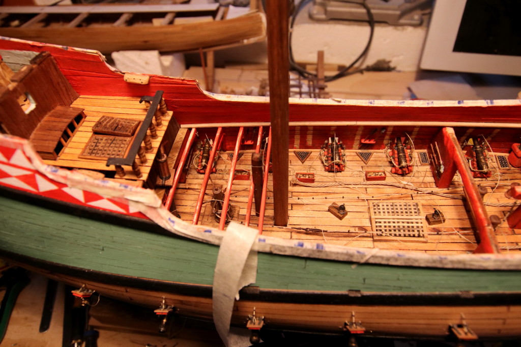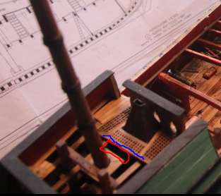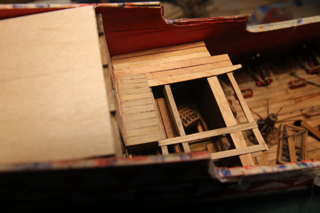 si tratta della parte esterna sopra il ponte di batteria dove è allocata la pompa di sentina e sopra questa il ponte ha una parte a "sbalzo" con le aperture ai lati per le scalette, ho posato dei listelli in noce sulla parte a vista , ed ho preparato la travatura d'appoggio del ponte che è sopra lo spazio dove risiede il timoniere, visibile in parte dalla zona scoperta del casotto dove manovra, posato i bagli come riportato nel disegno (ma a mio parere inferiori come numero quegli che probabilmente erano presenti)
