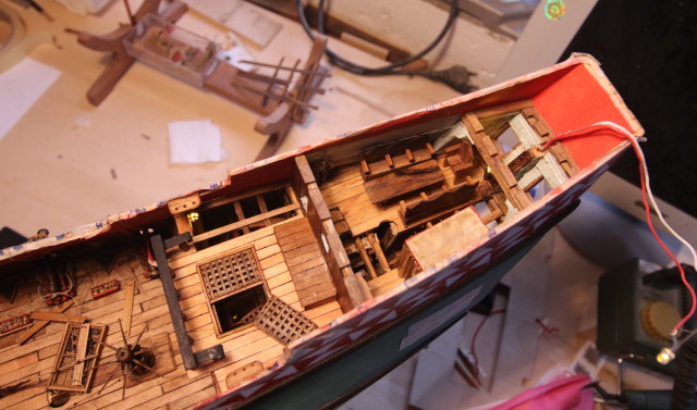 nella foto sotto si vede l'alloggio del capitano, ho tolto la struttura d'appoggio del tavolame, molto probabilmente "alleggeriro'" il letto a baldacchino, sia perchè prende troppo spazio e sia perchè un capitano "livornese doc " si sarebbe rifiutato di dormire in un letto di "simil fattura"