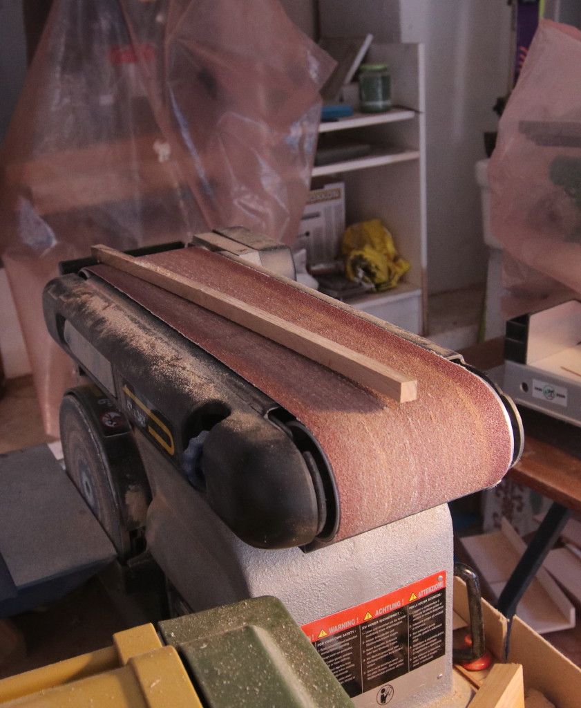 il legno utilizzato è il cirmolo (si tratta d'avanzi ...) è un essenza che si lavora bene poi ha una caratteristica, la leggerezza e "l'assorbenza" dei liquidi (compreso il vinavil) questo mi permette di attaccarli "al volo" sulla murata e sul trincarino, dopo un paio di minuti ci piazzo la mensola, variando tra le tre misure ricavate, anche questa mettendola sotto al baglio e facendola aderire alla murata, ovviamente avendoci distribuito un po' di vinavil,