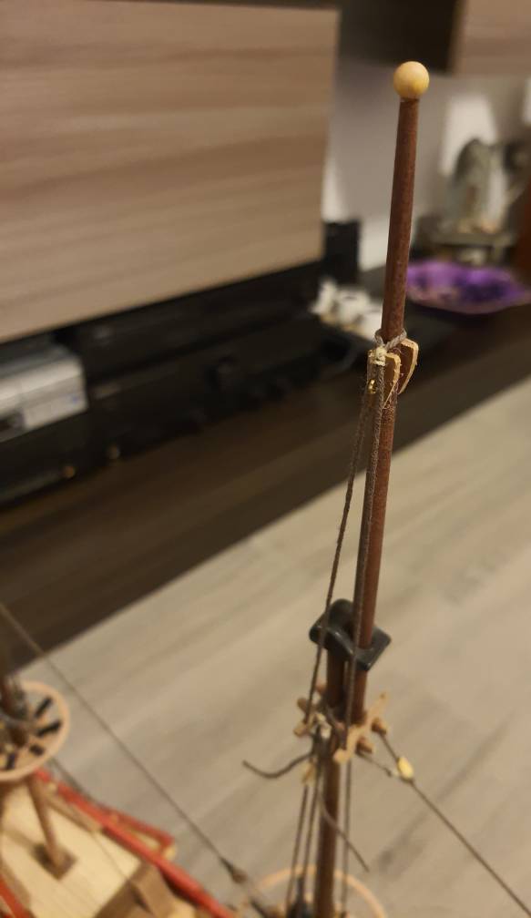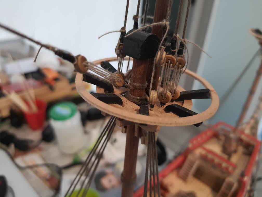 Intanto il lavoro é andato avanti... poco.. sono riuscito a montare tutti gli alberi, fissare gli stragli e sartie, ora sto procedendo con le sartiole, peccato che una delle crocette mi sia crepata mentre forato, niente che una goccia di colla non possa sistemare.