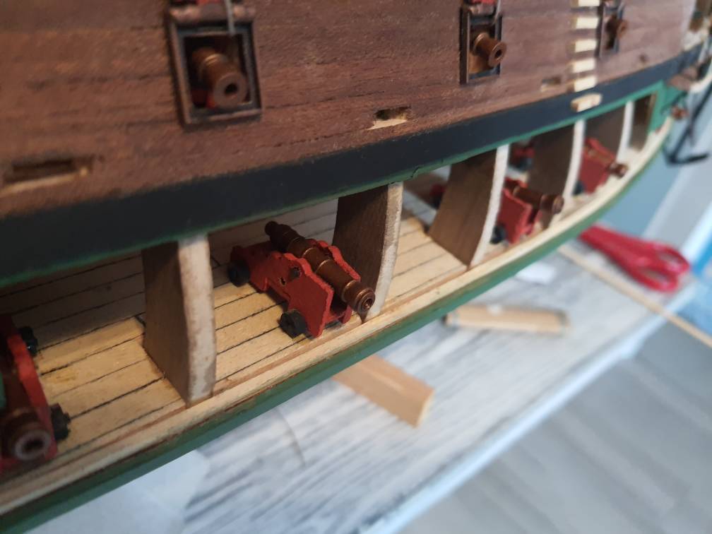 Stamattina il secondogenito mi ha ribaltato il modello per terra spaccando il giardinetto e facendo volare via i due cannoni di poppa. La cosa da una parte mi ha tolto 8 anni vita e fatto rispolverare un pó di turpiloqui in lingua madre che credevo aver dimenticato, dall'altra mi ha facilitato, perché dovendo verniciare le canne, facendole diventare così da ferro in bronzo (grazie Fabio!!    ) mi fa fatto lavorare meglio su due di quelle che sarebbero stare irraggiungibili... prendiamola così!!!