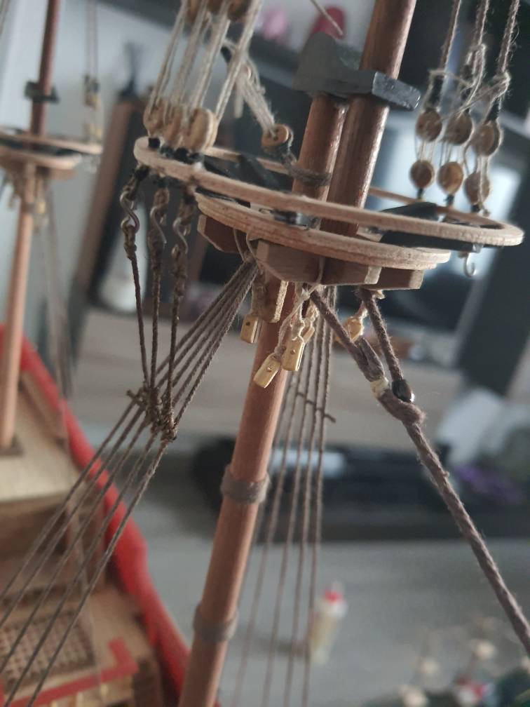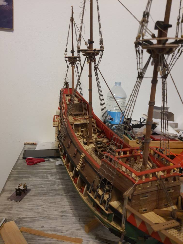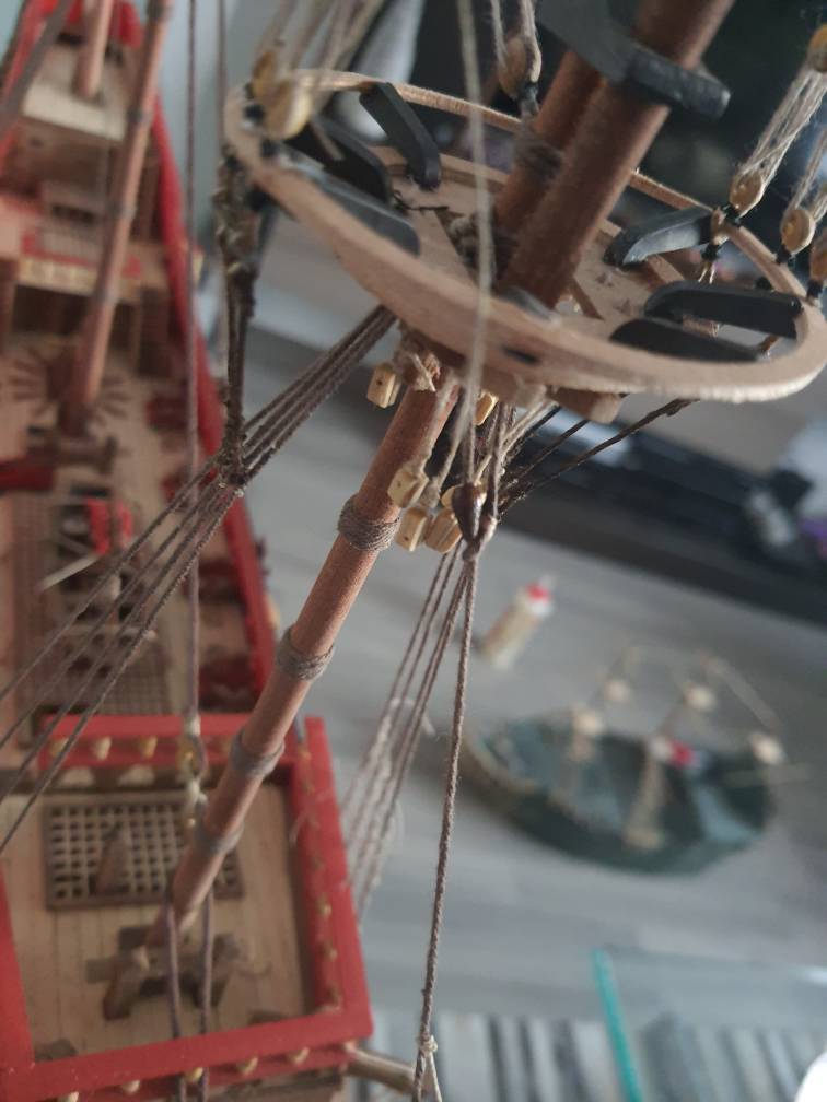 Devo ancora rimettere in posizione i due cannoni volati via dalla poppa, mi blocca il ricordo delle difficoltà per inserirceli, poi al momento non ho voglia di interrompere il lavoro sul sartiame, forse settimana prossima.