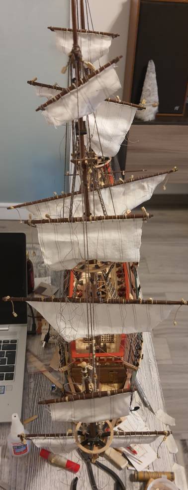 2) secondo una mia radicata convizione, ogni buona modifica deve essere reversibile in qualunque momento, regola d'oro dei miei tempi da centauro, per cui, avendo scelto di posare le vele imbrogliate (quindi la stoffa usata é stata ridotta notevolmente) per questione di visibilità del ponte e dei suoi particolari, se un giorno decidessi di mettere su le vele "sciolte" tutte o in parte potrei usare le sue originali.    . Essendo le vele state realizzate senza cuciture, vista la particolare posa, eventuali sfrangiature sono state corrette dopo che la mistura di acqua e vinavil, cosparsa sulle vele si é asciugata e le ha "cartonate" per cui renderle lineari é stato molto più semplice.