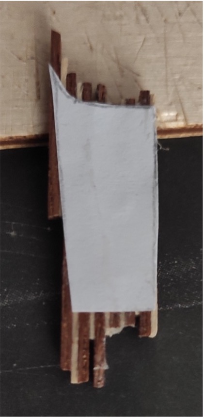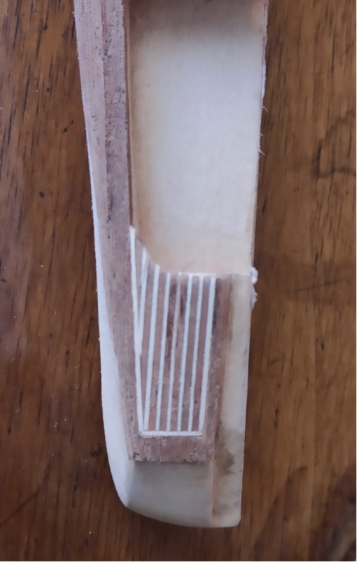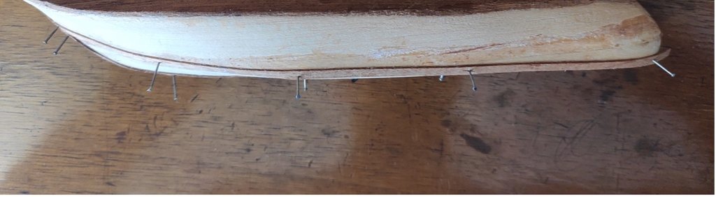Poi, seguendo i vostri suggerimenti e usando degli avanzi di listelli, ho fatto una prova accostando di taglio listelli da 1 mm (noce) e da 0,5 mm (tiglio). Il risultato è molto buono e anche la scala è tutto sommato paragonabile a quella del mio modello. Pertando aggiungerò all'ordine anche questi listelli usando ovviamente il mogano al posto del tiglio.