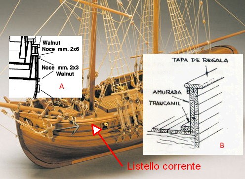 Ho qualche dubbio su come procedere per il "capo di banda" (parapetto?): nella figura A la sezione come la propone il piano di costruzione, con un listello superiore largo ed un listellino esterno, nella figura B quello che secondo me ha più senso e che andrei a fare, eliminando gli scalmotti provvisori e mettendone nuovi ad un passo più realistico (circa 45 cm in scala al vero).
