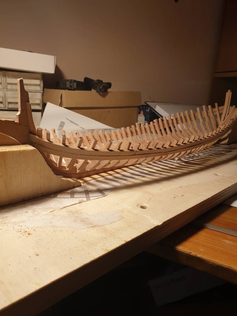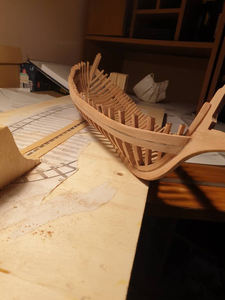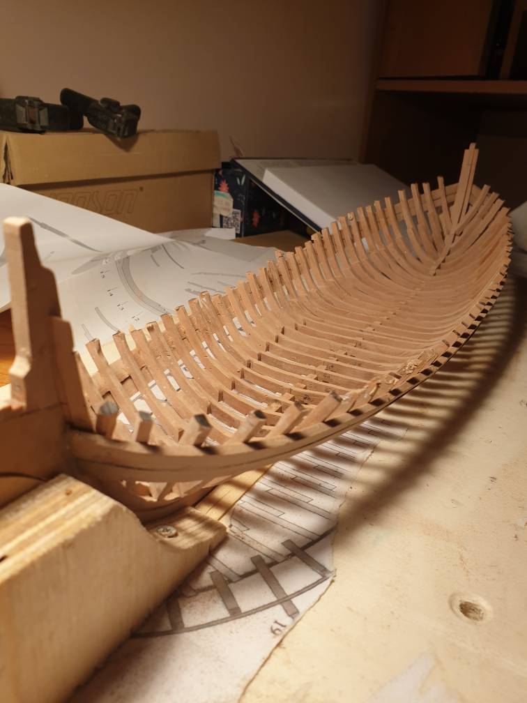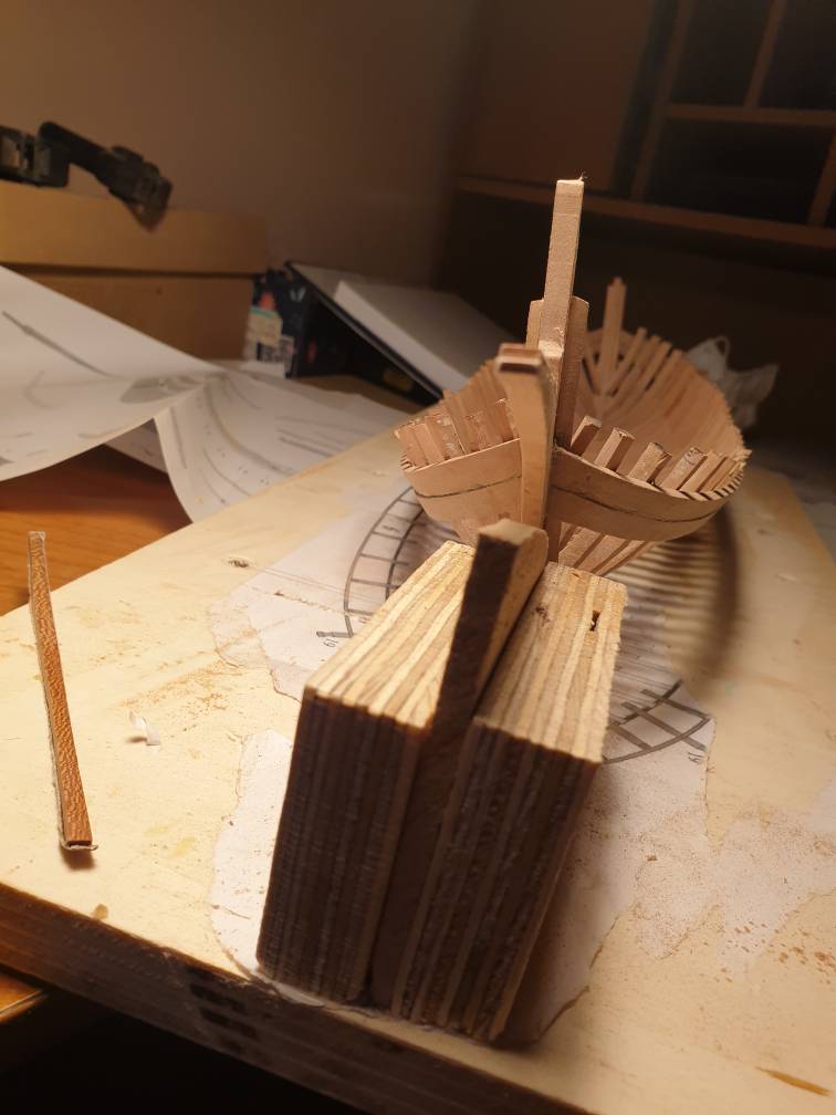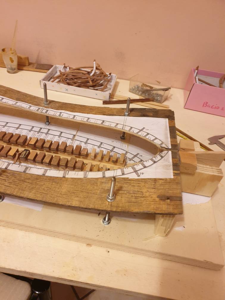 Poiché le ordinate sono inchiodate alla chiglia senza uno scasso occorre un distanziale provvisorio per posizionare i manieri Ti allego una foto,il pettine rimane fisso nel cantiere Allegato 387693