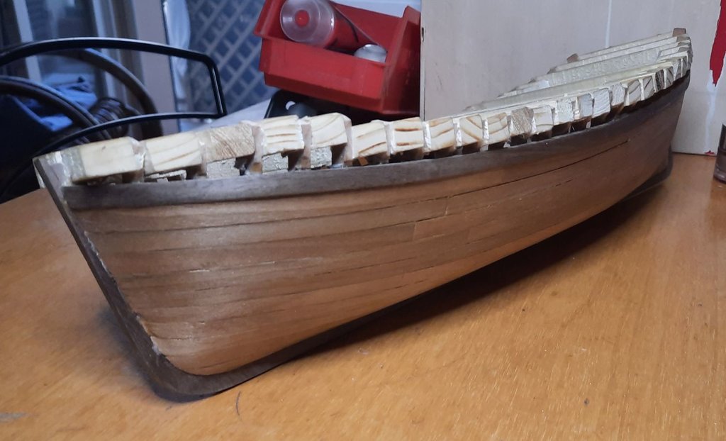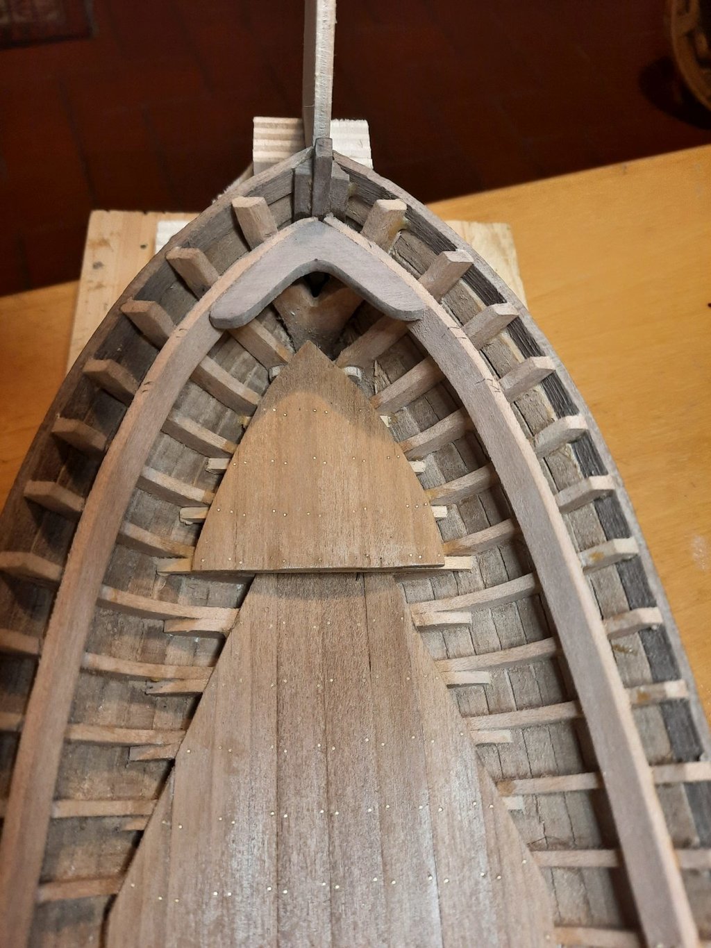 Si procede con l' interno: montato il tavolato di fondo, i paglioli, le ghirlande di poppa e di prua, la serretta di banco, con qualche prova di chiodatura.
