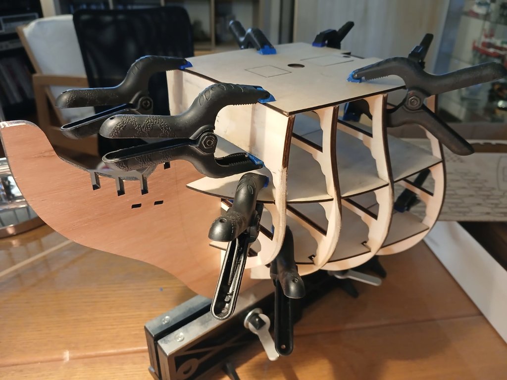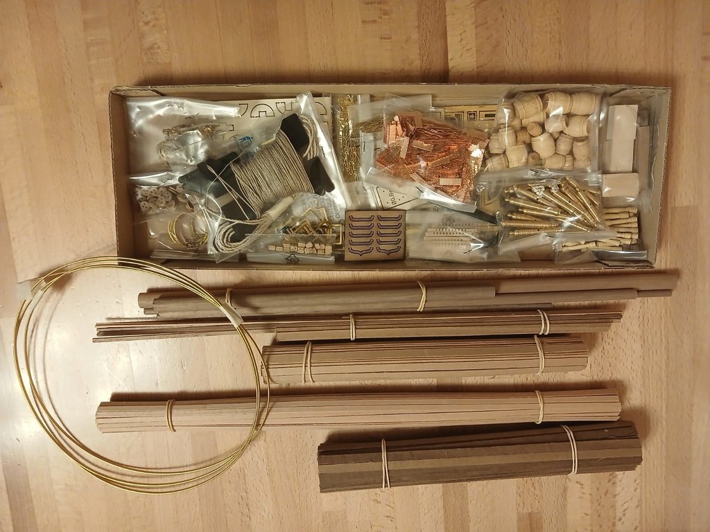 Allora, facendo diverse prove soprattutto se col trapano sarei riuscito a fare i buchi degli occhielli per la legatura dei cannoni (cosa non prevista dal kit), ho elaborato un’altra sequenza di montaggio. Per prima cosa realizzerò i 2 ponti inferiori e il pavimento del terzo, poi il fasciame comprensivo di rivestimento in rame dell’opera viva e apertura dei sabordi e poi tornerò a lavorare sui 3 ponti mancanti. Questo mi dovrebbe permettere un certo spazio di lavoro per realizzare un modello il più fedele possibile all’originale.