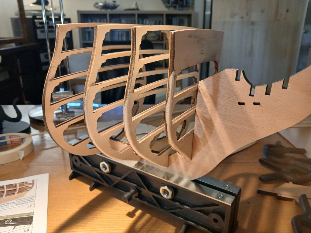 Intanto ho rastremato le ordinate e le ho incollate alla chiglia. I ponti che vedete nelle foto sono stati solo appoggiati per tenere il modello nella giusta posizione.