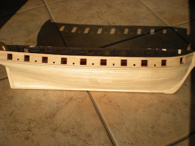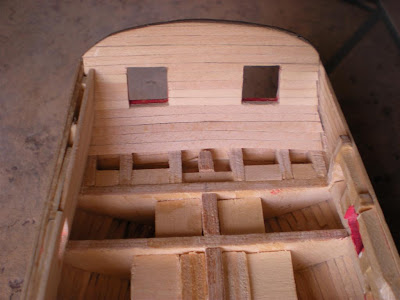 Tornando a faccende più interessanti per voi tutti, ho quasi completato il rivestimento dello specchio di poppa, manca ancora un altro strato di fasciame parzialmente sovrapposto a quello che vedete nella foto