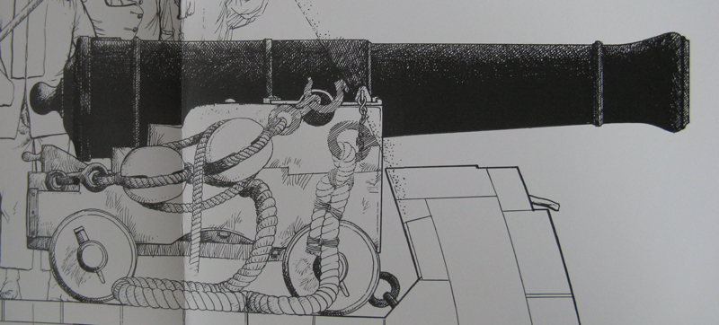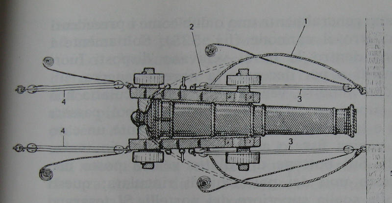Il disegnatore che ha ispirato Curti ha voluto mostrare la differenza di fissaggio della cima di rinculo nel '600, così come avveniva nelle diverse marinerie. Per mostrare la variante "inglese" (serraggio a culatta - cima tratteggiata) rispetto allo schema "franco-ispanico-olandese" (serraggio ad affusto - cima a tratto pieno) ha utilizzato i golfari che .... nelle altre due foto sono occupati proprio dai ganci dei paranchi di manovra!!!
