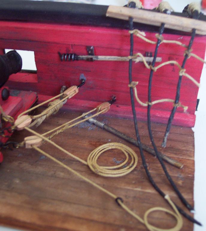 passi col rosso l'interno del sabordo e dell'impavesata..pi controlli che sia asciutto tutto, ti sporchi le dita di cenere, e ripassi il contorno dentro e fuori e poi toccaccia l'impavesata..infine pennellino vecchio tutto sfibrato, con i peli tutti separati e spennelli i bordi, il trincarino (mettilo prima di colorare e fai rosso anche quello)