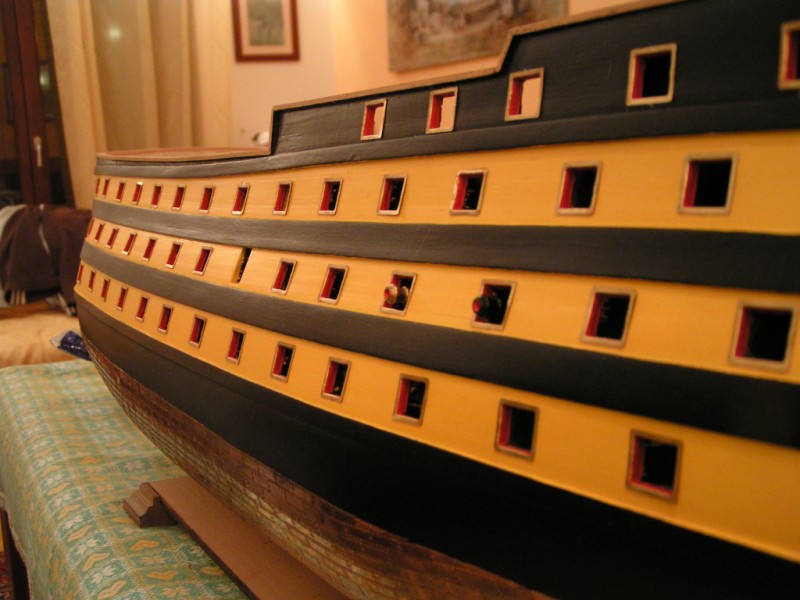 I sabordi sono tagliati in opera (cosa che volevo inizialmente evitare), quindi i corsi di fasciame fino all'incintone seguono le linee dei sabordi, e non quelle che avranno successivamente. QUesto significa che il secondo fasciame non sarà sovrapposto esattamente al primo, ma sarà incrociato. Il che...non mi dispiace...