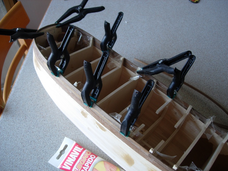 Le zone più scure che si vedono all'interno del fasciame a prua ed a poppa sono stucco plastico, che ho messo a rinforzo per la ssuccessiva levigatura esterna. Mi erano venuti un po' di gradini così ho preferito andare sul sicuro.....