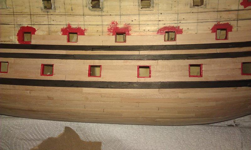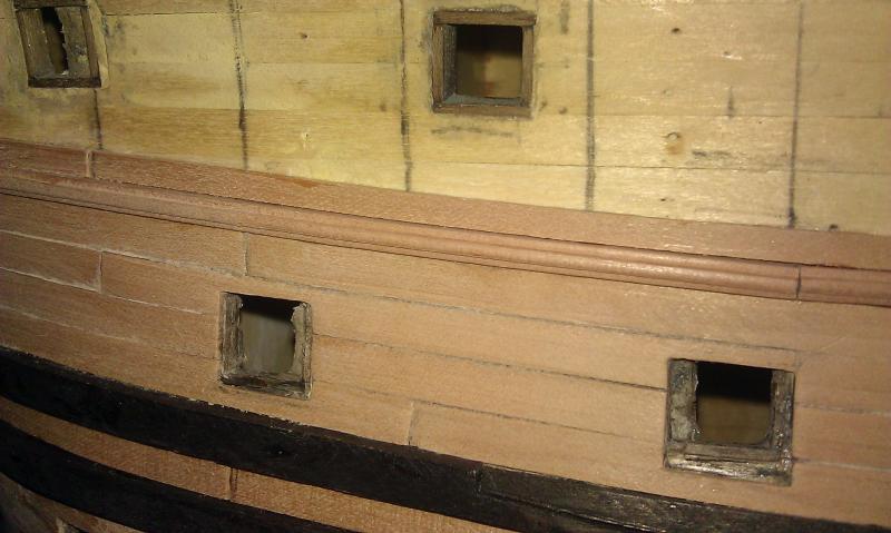 Allo stato attuale ho incollato solo il primo miniincintone modanato e il listello 4x1mm subito sopra nel loto dove i sabordi rimarranno chiusi (mancano ancora i portelli da montare ma prima voglio finire di fasciare tutto lo scafo).