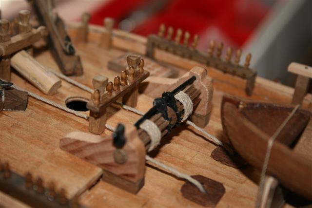 @gpone: io di solito faccio scuri anche gli stroppi (=legature) dei bozzelli sul pennone. Ma non ho trovato indicazioni esatte in tal senso, dunque vedi tu. Per colorare ciò che hai già messo in opera, prendi del mordente e bgnaci la punta di un pennellino; poi appoggia appena appena la punta del pennellino alla cimetta e vedrai diventarla nera in un battibaleno.... fai l'operazione con delicatezza e dopo aver appoggiato la punta del pennello toglila immediatamente, altrimenti "scarichi" troppo colore (la cimetta continuebbe a "bere"....).