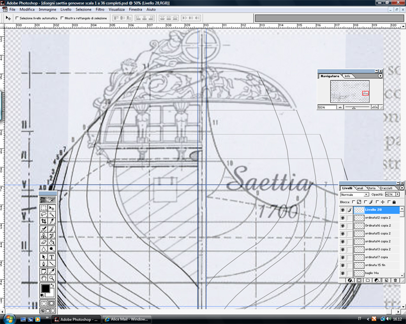 Anche se sto seguendo i piani DellaBarba non ho saputo resistere ad impostare anche una versione più vicina allo spirito di Sir Francis, le cui delucidazioni mi sono preziose (decisamente, guardare i threads è bello ma per rendersi effettivamente conto di quello che c'è dietro bisogna ricalcare le orme... come mi è capitato di fare proprio con la Saettia)