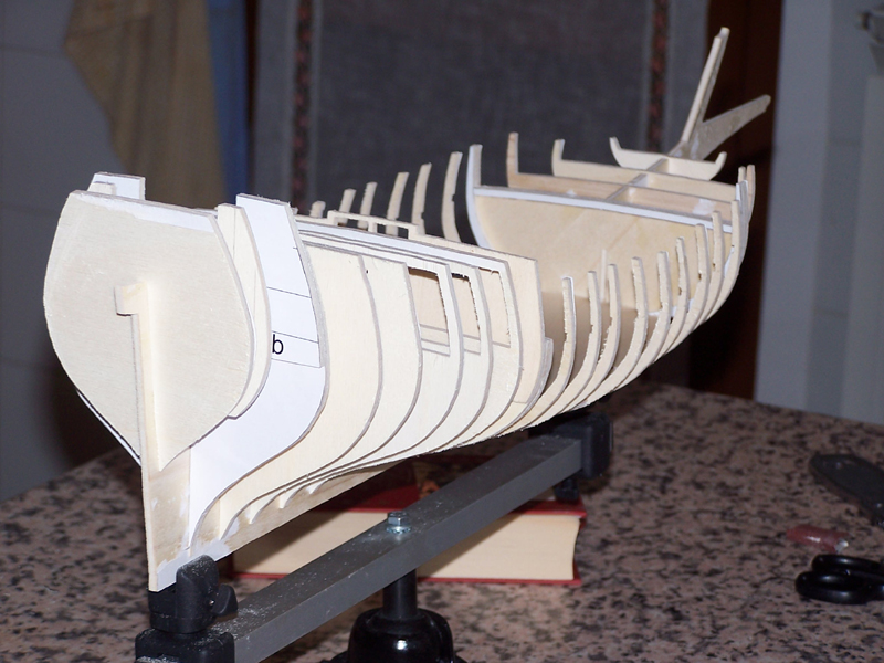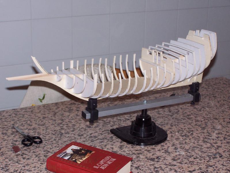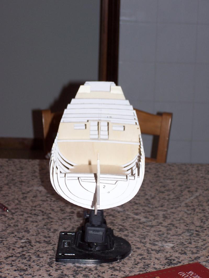 - E' RIDONDANTE. Nonostante abbia dimezzato il numero di quinti previsti dal disegno (23 contro 46), per essere un modello ordinate&fasciame ha un tantino troppe ordinate. Alcune non servono a definire il profilo dello scafo e si potrebbero tranquillamente eliminare. Ad occhio e croce, una versione progettata bene potrebbe essere formata da sole chiglia e 15 ordinate.