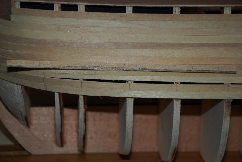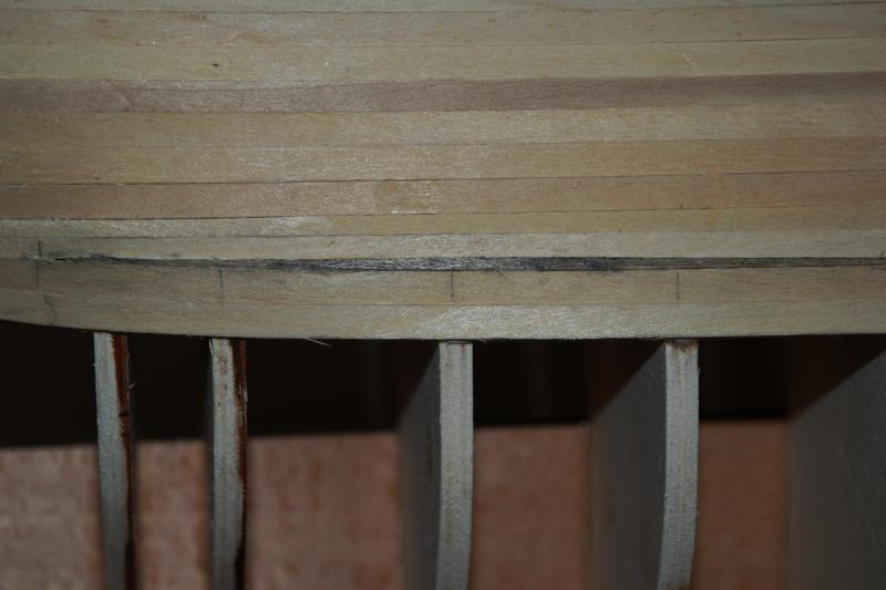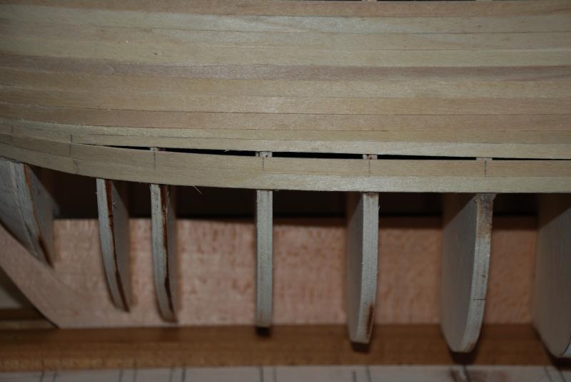 Otto listelli interi mi sembrano troppi e quell'"abbassamento" a prua dei corsi di fasciame ne è la prova: quello è un andamento dovuto proprio alla mancanza di assotigliamento. Dopo 3-4 listelli è bene pensare a rastremare.