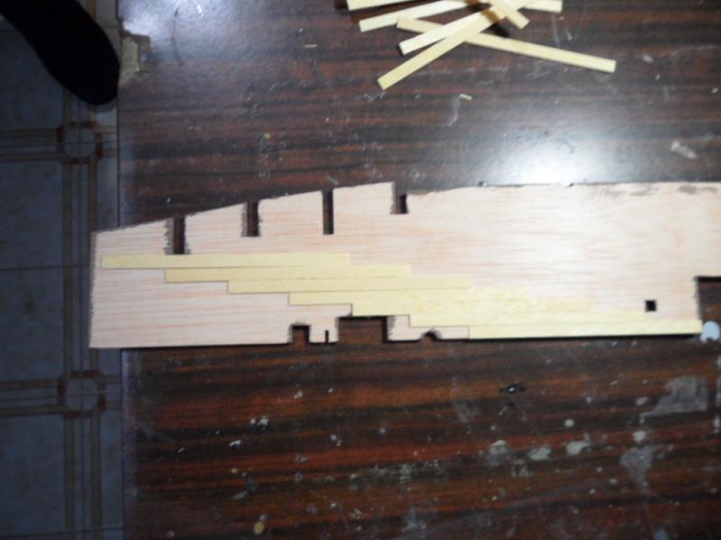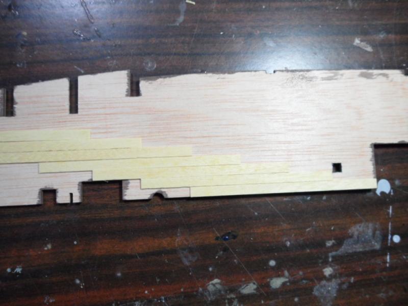 rieccomi con l'inizio del rivestimento del ponte superiore col sistema 1/4, unico dubbio riguarda i listelli in corrispondenza delle aperture dei boccaporti che in alcuni casi risultano troppo corti, ma non credo ci sia una soluzione di continuità, voi che pensate?