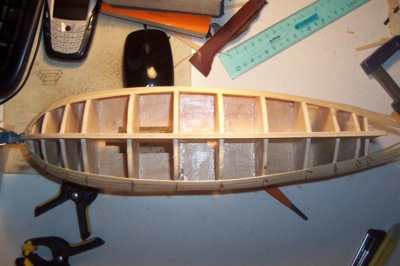 Il sospetto di avere poco spazio a prua mi è venuto quando oramai era troppo tardi. Spero di trovare il modo di finire di incollare questi listelli e avere uno scafo quantomeno solido.