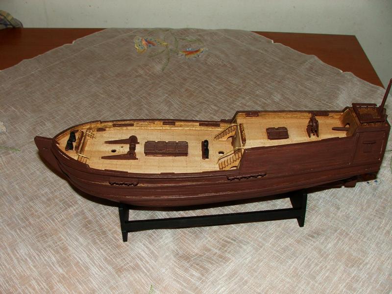per lo scafo ho usato un colore acrilico opaco comperato in un negozio di modellismo. il ponte l'ho invecchiato con impregnante noce chiaro e una mano di trasparente acrilico. il fasciame è messo da cani, ma in compenso è abbastanza simmetrico. quando avevo messo il primo fasciame mi ero accorto della chiglia storta ed ho sbagliato del tutto i corsi del 2 fasciame.