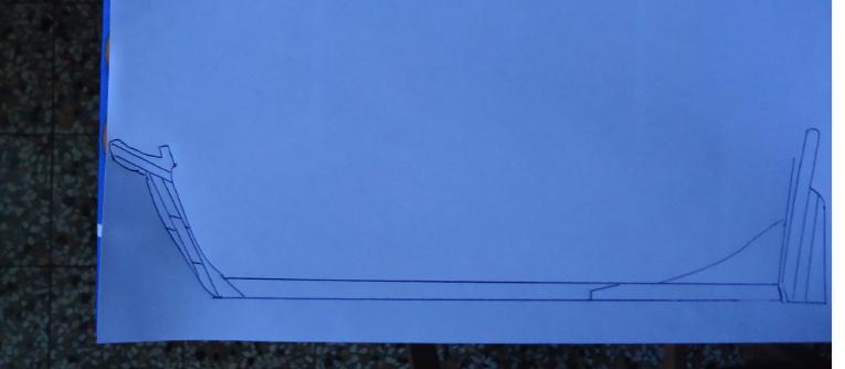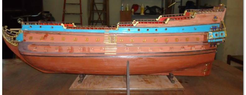 Consultando la Euromodel risulta che il Royal William ha uno scafo di 91cm., io stò lavorando su un relitto abbandonato presso i cassoni dei rifiuti con scafo di 89cm, quindi differenza minima con il Royal William, e la chiglia è di 8mm senza rivestimento, dipinta come il fasciame.
