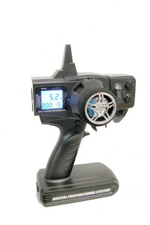 Possibilità di regolazione fine della risposta del gas, del freno automatico tipo ABS, esponenziale del gas e dello sterzo. 15 memorie per la registrazione di altrettanti settaggi o modelli diversi. Nel caso in cui decidiate di installare delle stilo ricaricabili, la trasmittente è già predisposta per la ricarica con un cavo jack esterno.