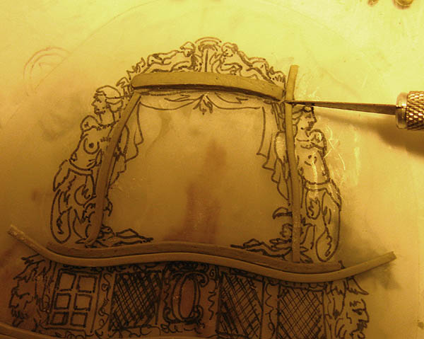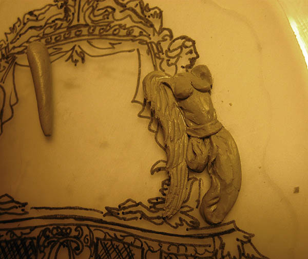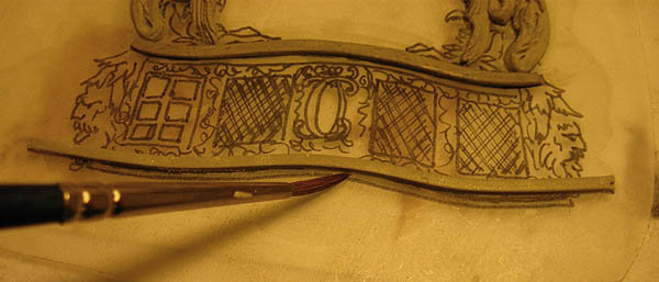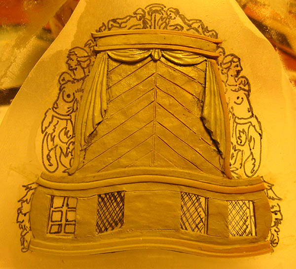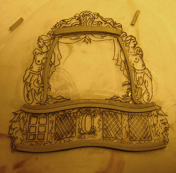 ...terminato di scolpire lo scudo e ben indurito, lo incollo direttamente sullo specchio di poppa, aggiungo le sirene, completo direttamente sul legno le teste ai lati della balconata, metto ad in durire...