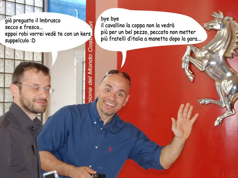 ..... Lapo Gionc : pilota e copilota ..... splendide intraversate in centro a Maranello.... e sgasate sulla via dell' Abetone.... Matilde ( simpaticissimo) = archivio vivente...... ottimo cicerone e guida per la galleria ferrari.... Lapo ti leggo ora..... PER LA GIOIA DI TUO BROTHER