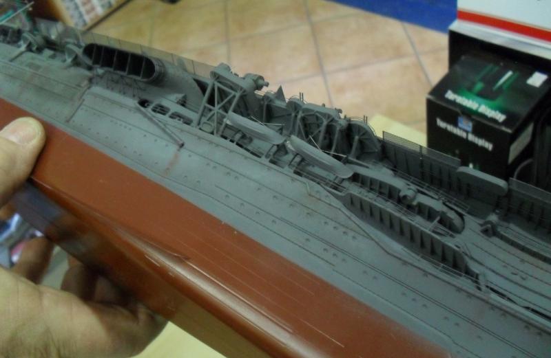 ...si, si, bello.... però io vedo (faccio finta di essere un esperto modellista...) dei punti dell'intelaiatura dove spunta il metallo della fotoincisione color ottone... inoltre le colate di ruggine sulla chiglia mi sembrano un po' troppo finte; eppoi il grigio è troppo uniforme, forse un po' di sporcamento sarebbe utile... Inoltre con tutti quegli aerei sul ponte come cacchio fanno a partire? Senza rincorsa?