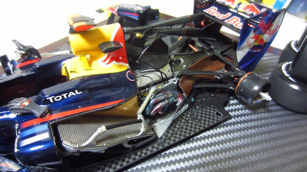 Mi correggo, ho visto adesso che l'hai montata sul cofano, ma in realtà andava montata sull'ala è collegata al duct system! Non è certo un errore grave, però dato che hai fatto un ottimo lavoro potresti provare a rimediare....l'ala posteriore si collega al cambio tramite un perno liscio, se non lo hai incollato potresti sfilarlo e quindi staccare la parte dal cofano e inserirla nell'ala....ma non è un lavoro semplice!!
