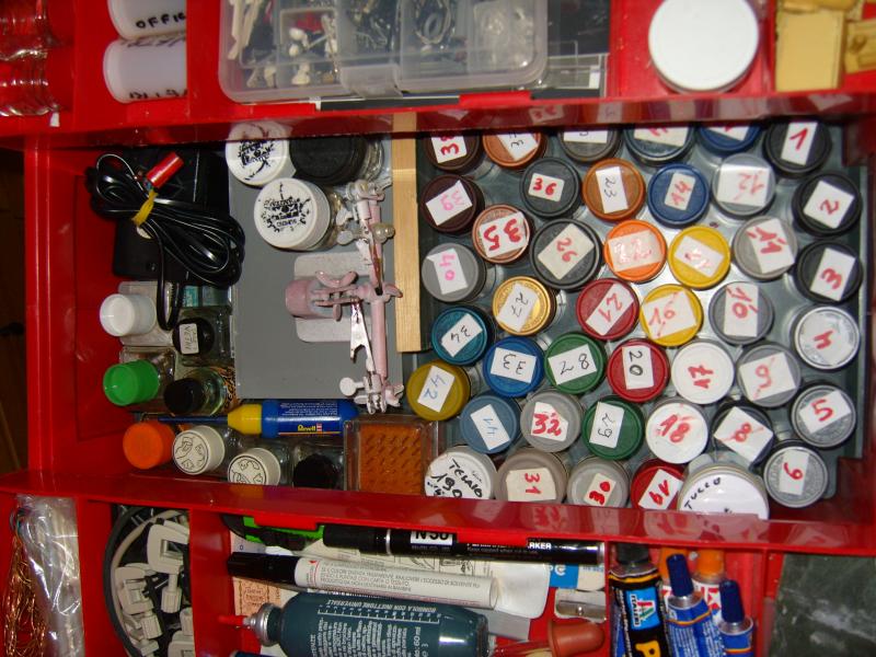 Il mio materiale si limita a: 3 pennelli, trochesino, lima, cutter, una quindicina di colori Tamiya, 3 bombolette, un vecchio lettore cd adibito a tagliere, una boccetta di diluente Revell e una tovaglia da mettere sul tavolo.