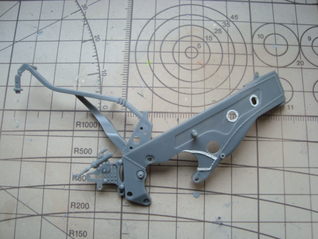 ho riempito il forcellone con milliput e plasticard poi l'ho primerizzato e verniciato. ho riservato questo trattamento solo al forcellone e non al telaio perché la moto essendo sprovvista di un parafango posteriore lascia in vista la parte interna di questo particolare (...e poi pure per andare un po più spedito!!!). Verniciato anche il telaio, con le modifiche fatte alle saldature, già segnalate in precedenza.