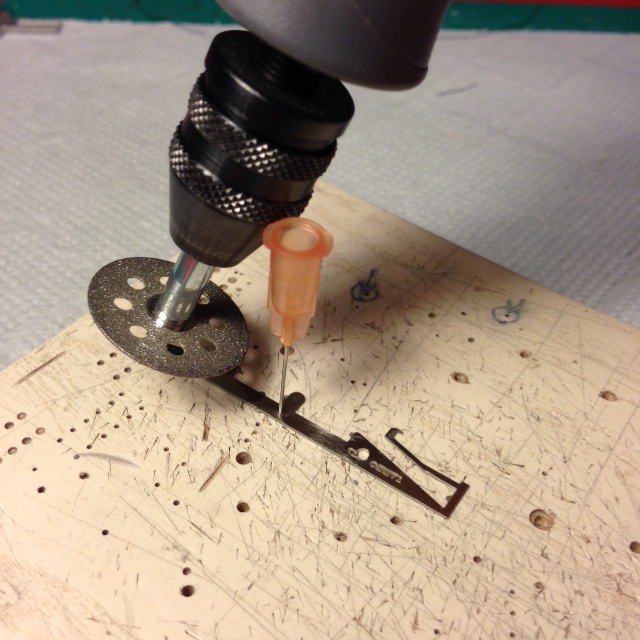 Comunque, per rispondere a Bruno, penso che ci sia sempre da imparare. Io per esempio non sono assolutamente capace a saldare a stagno e sul forum ho trovato dei post stupendi in merito. Ho visto lavori spettacolari Per quanto riguarda il taglio degli aghi uso questa tecnica: ho preso un pezzo di fotoincisione e l'ho forata del diametro che mi interessa in questo caso 0,5 mm su una tavoletta di legno ho fatto un foro dello stesso diametro e profondo la misura che mi serve tenendo conto anche dello spessore della fotoincisione Allegato 201032 ho inserito l'ago nel foro della fotoincisione e poi l'ho inserito nel foro sulla tavoletta andando a fondo infine ho tagliato l'ago con una moletta diamantata della Dremel a filo della fotoincisione Allegato 201033 Per la piega dell'ago ho semplicemente usato una pinza dandogli la curva desiderata; il tubicino non si schiaccia se fai delicatamente |