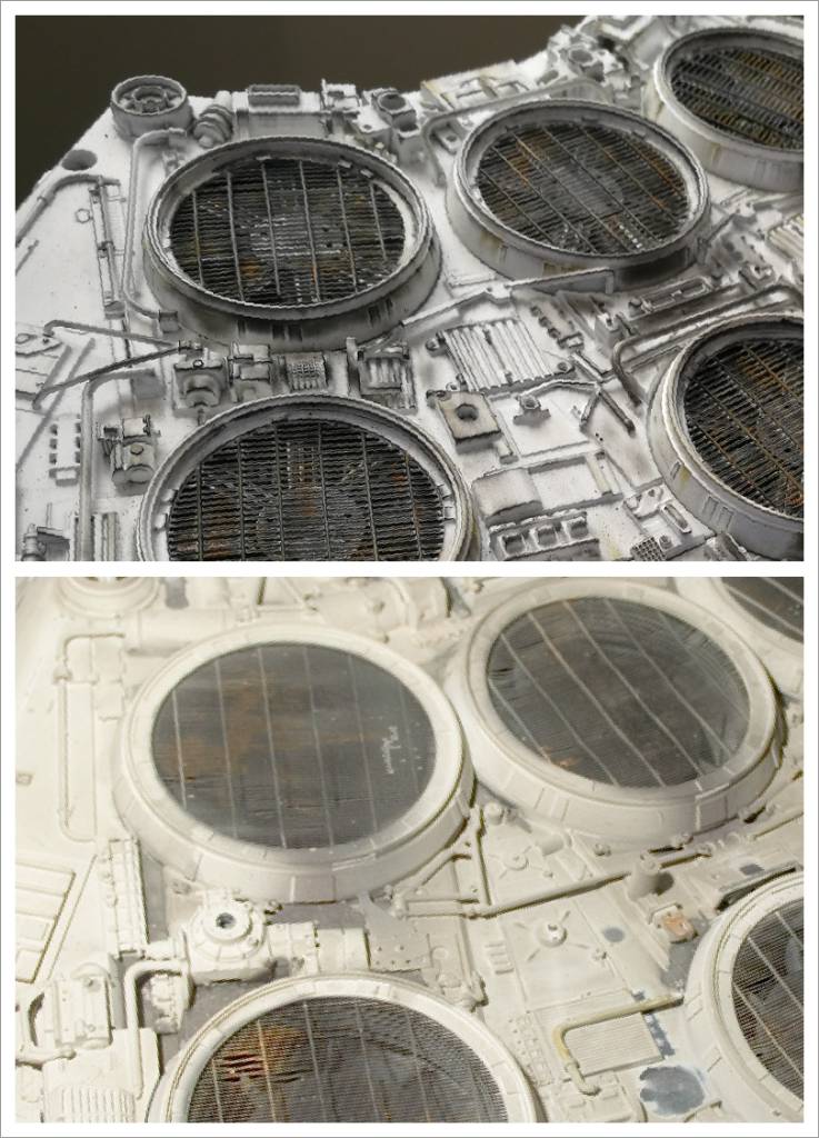 Sul modello originale i modellisti della ILM hanno usato un materiale metallico che si usa per rivestire le finestre degli edifici chiamato koolshade, una sorta di zanzariera che però non è la comune retina, ma una retina che funge anche da parasole viste le micro alette regolabili. Ovviamente non essendo possibile riprodurre la retina in questione, o la si stampa in 3D, oppure si comprano le fotoincisioni. O meglio ancora si compra direttamente la retina che purtroppo in Italia è importata solo da un'azienda che, o ne prendi na vagonata o niente, e comunque a prezzi esorbitanti, tra l'altro non si è neanche sicuri se è in scala oppure no, visti i diversi tipi presenti in catalogo.