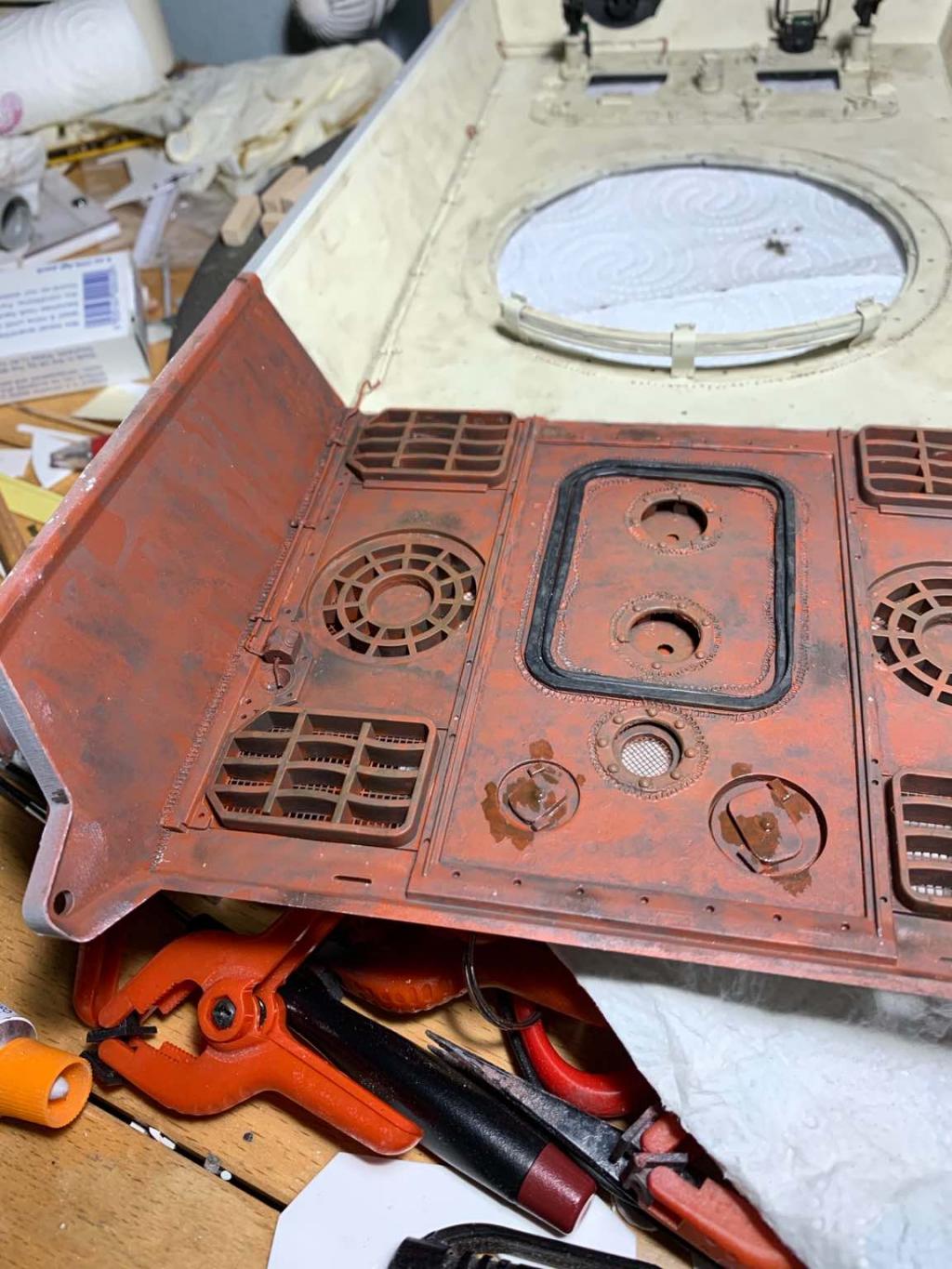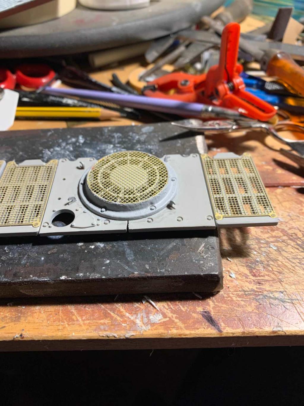 Le coperture dei radiatori sono presenti in una unica lastraAllegato 344960 In realtà sarebbero separati in due e le protezioni delle ventole sono in un blocco in fusione Allegato 344962Allegato 344963 Ho preparato le grate anti-mina Allegato 344965 Corretto l’altro errore ossia avevo dimenticato lo zimmerit nella parte bassa del portello di carico/fuga Allegato 344966 Assemblaggio del “engine deck “ completo con portellone apribile ( non serve a nulla essendo tutto aperto ma fa lo stesso) Allegato 344967Allegato 344968Allegato 344969Allegato 344970 Ho sostituito i primi gancetti sulla fiancata con altri in ottone Allegato 344971 Inviato con il mio iPhone - Scarica l‘app del Forum di Modellismo.net |