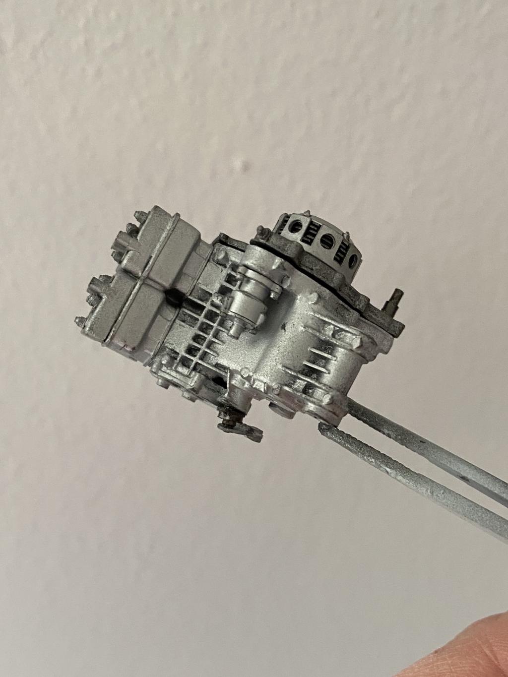Direi il blocco motore è terminato al 90%, ho fissato tutta la minuteria, le candele, pacco frizione, leveraggi del cambio, sigillato tutto con trasparente satinato e fatti risaltare le parti metalliche con un dry brush leggero... alcune foto, prossimo step il circuito di raffreddamento .