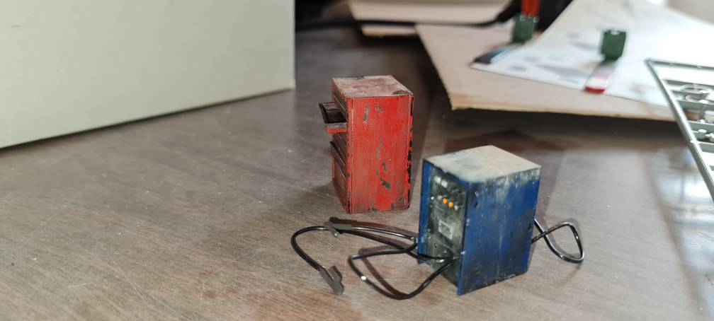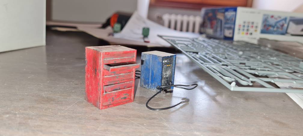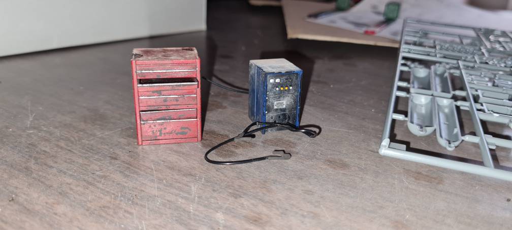 Mi piace molto quello che stai realizzando, anche se forse, come ha fatto notare Bruno, hai avuto la mano un po pesante con le sporcature. Intendiamoci: hai sporcato molto bene, ma è poco probabile che in una officina ci siano oggetti così malconci. Prosegui così, ti seguo con interesse.