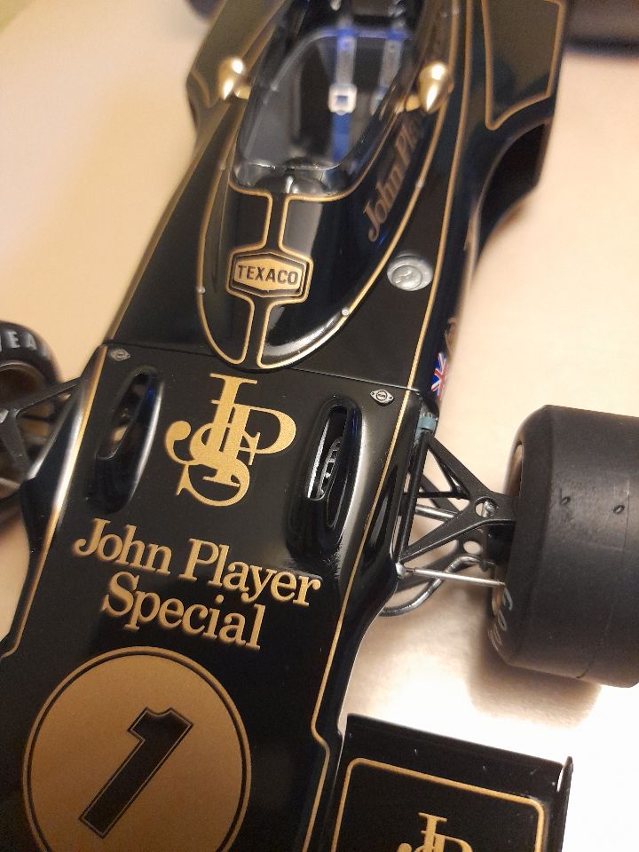 lotus 72 e finita, posto qualche foto,poi devo pensare a una basetta magari in tema JPS pensavo nera, realizzo delle striscioline color oro e un rettangolo a specchio sotto la macchina oppure di alluminio che stacca un po,ciao alla prossima.