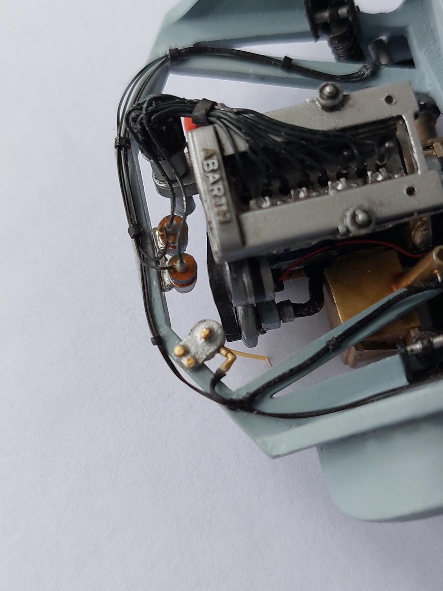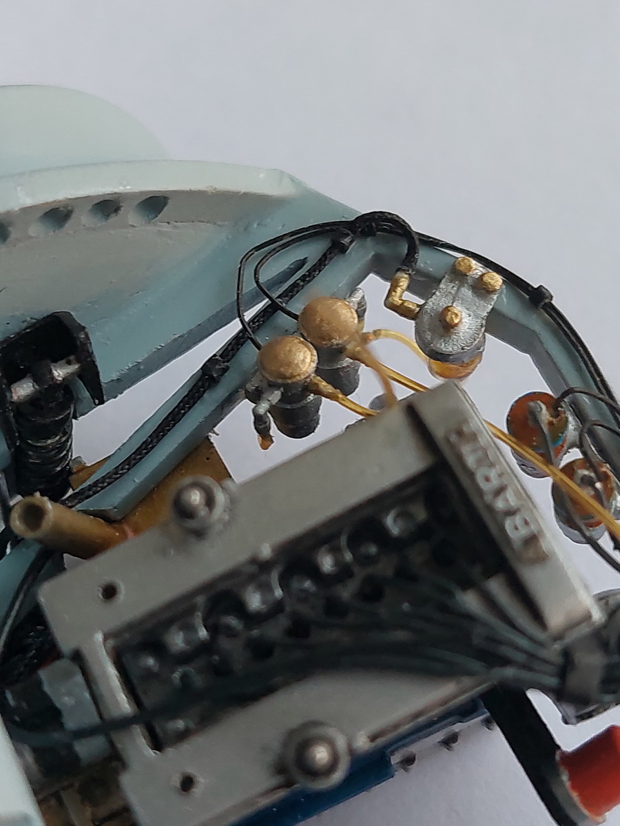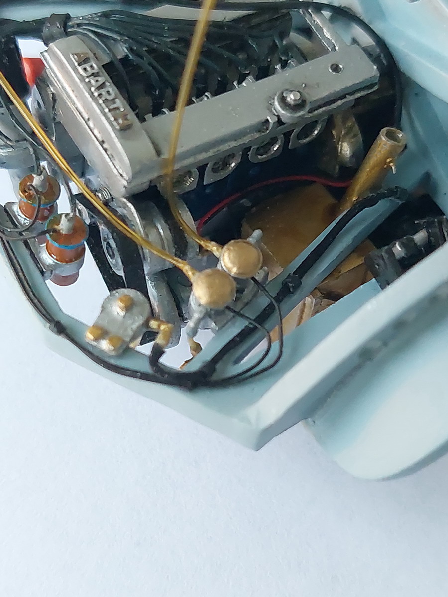 il terminale, a tromboncino, lo monterò una volta che la vettura sarà sulle sue ruote. Come si vede con i continui maneggi ho asportato parzialmente la vernice Tire Black sui cavi candele che dovrò provvedere pertanto a ripristinare prima della fine