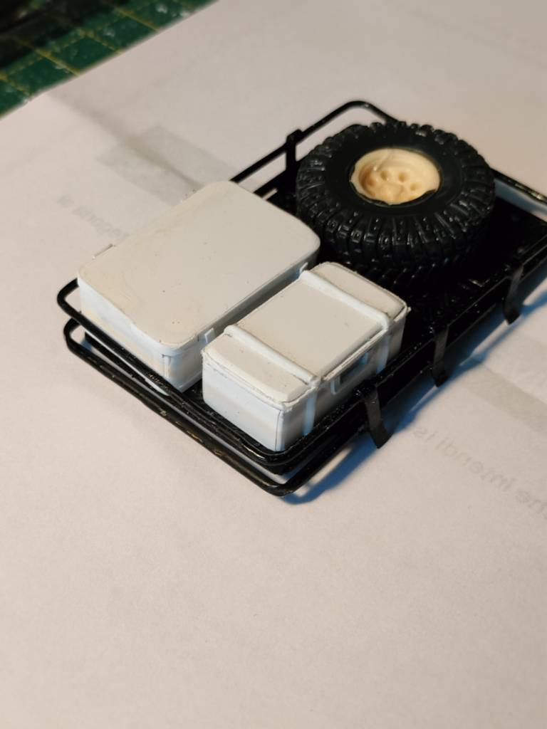 Il portapacchi dovrà presentarsi così: ruota di scorta (troppo grande per stare nel bagagliaio), una cassa in alluminio e una specie di pelican case. Il tutto per adesso è molto grezzo.