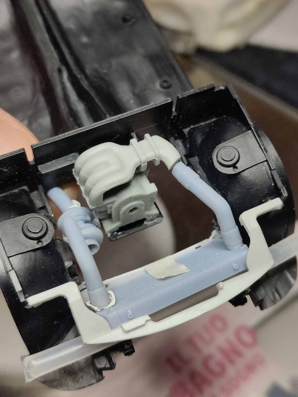 lo scarico al momento è in un pezzo unico, anche questo fornitomi dal buon Claus, ma credo dovrò separarlo in due pezzi perché così è un incubo da montare, senza contare che andrà montato a macchina chiusa perché altrimenti il fondino non si infila nella carrozzeria
