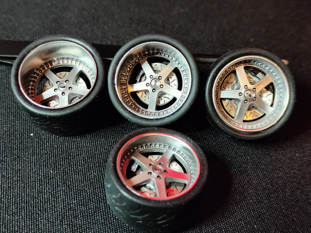 nel frattempo ho messo insieme anche le ruote. mi sono preso qualche licenza artistica perché, per quanto riguarda i freni, non sono riuscito a trovare nulla di specifico. in alcuni modelli i freni sono di serie, essendo una demo car, ed essendo quella del film fatta in più modelli, è sempre un casino avere reference accurate.